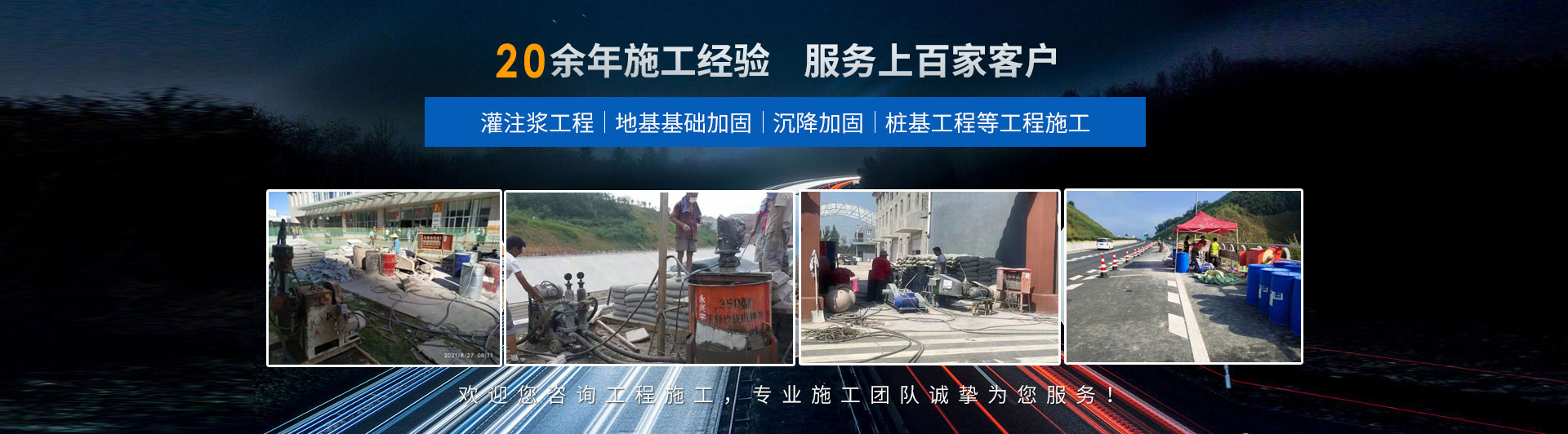 承接全国范围内高压注浆 ,地基下沉注浆,房屋下沉注浆,设备基础下沉注浆,铁路路基下沉注浆,厂房地基下沉注浆,路面下沉(塌陷)注浆 等施工业务,公司拥有机械设备百余台,施工证书资质齐全,专业技术施工人员200余人,专业处理各种复杂地基工程,成功案例数千件,施工质量保证。